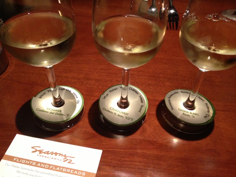 But let’s talk about the wine!! Being the wine lover I am, I was thrilled to be invited to enjoy the Flights and Flatbreads experience at Seasons 52 in the Chicago area. George Miliotes, Master Sommelier, chose three wine flights which will pair with your choice of their Signature Flatbread. Once you have selected your flight and have tasted, you may choose your favorite for a full glass. An added plus? A flight, flatbread, and glass of wine will cost a mere $15!! Interesting to me was the “Acclaimed Series” (cost is $20 and absolutely worth it!) which included a taste of St. Hallet Gamekeeper’s Reserve, Shiraz Blend 2010 from Australia, Tarima Hill Monastrell 2010 from Alicante in Spain, and Seven Falls, Cabernet Sauvignon 2010 from Washington. Wines in this series are rated 90 points or higher by Wine Spectator, Robert Parker, or Wine Enthusiast. My choice for a full pour (and this was a tough call) was the Seven Falls with its intense fruit aromas and tastes, vanilla, blueberry, and a rounded mouthfeel…ahhhh!
