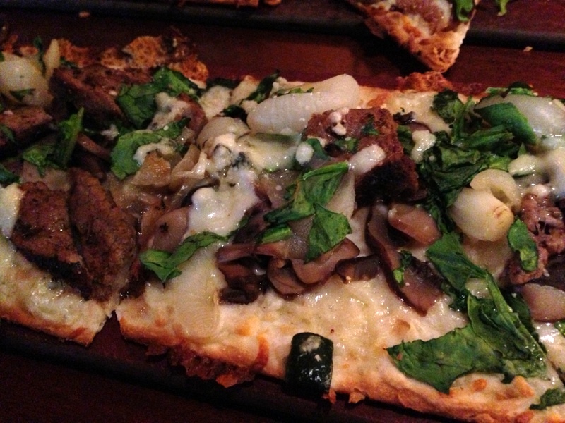 The “Spectacular Whites” flight for $15 included Raats Family Original Chenin Blanc 2011 from South Africa, Casillero del Diablo Viognier 2011 from Chile, and Chateau St. Jean Chardonnay 2010 from Sonoma County. The flight of “Remarkable Reds” consisted of Macedon Pinot Noir 2010 from Macedonia, Santa Cristina Sangiovese 2010 from Tuscany, and Juntos Merlot 2011 from Alicante in Spain. The selection of tastes and textures in all of these wines from around the world are meant to educate and please those who are newbies to wine as well as those who are aficionados! My Millennial family members who accompanied me to the Flights and Flatbreads experience chose the Viognier from Chile and the Sangiovese from Tuscany as their full glass. Both were happy wine lovers, too!