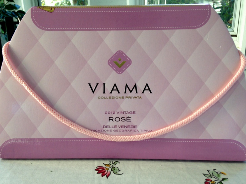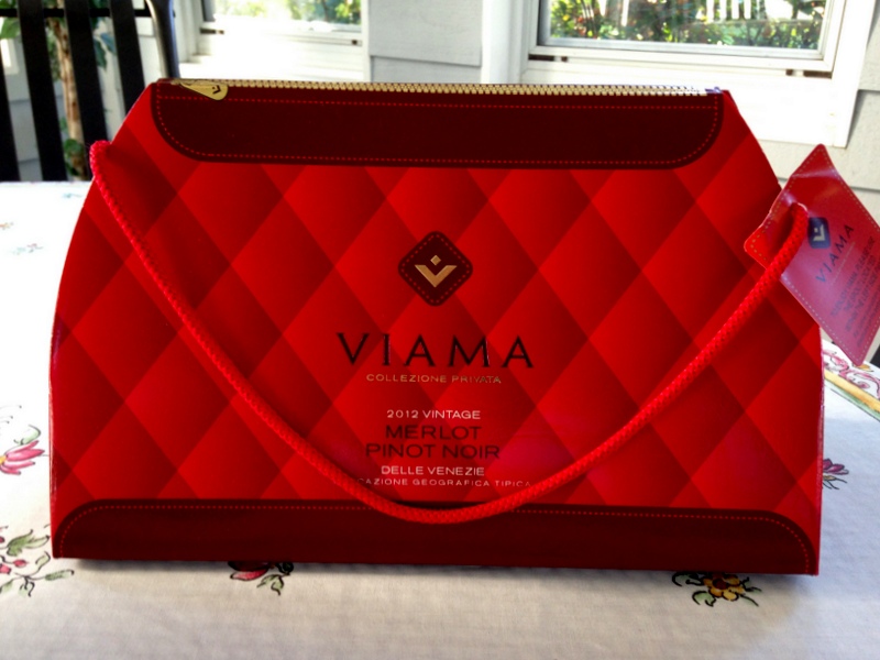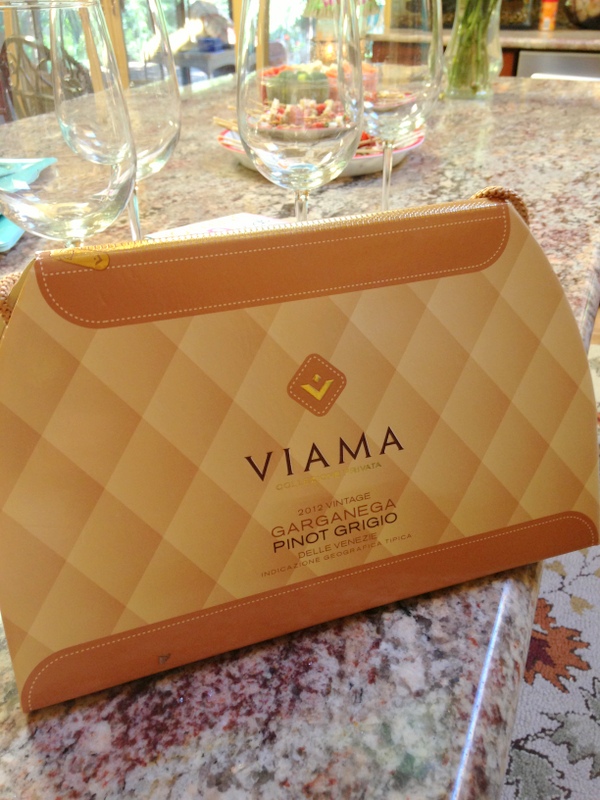 **Viama Pinot Grigio-Garganega 2012 – I brought this wine to an after work happy hour at the home of a colleague. The purse factor was a big plus and there was a bit of high pitched shrieks of delight when the ladies had their first glimpse. We poured then tasted. Admittedly, the wine was “just ok” at first…I found almost bitter tastes and some citrus with very high acidity after the first sip. However, the tastes were better with the second glass and others felt the same. With notes of honey, pear and apple, the wine paired just fine with our antipasto platter on the deck. Just be sure to serve it chilled!