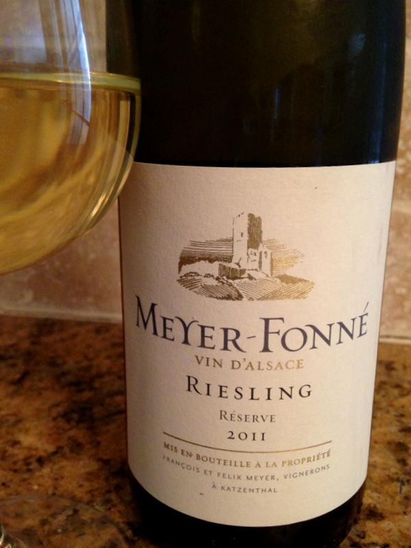 **Meyer-Fonné Riesling Reserve 2011 – I absolutely love and appreciate Alsatian Riesling for its aromatics and dry, not sweet, taste. This particular wine produced by Francois and Felix Meyer is 100% Riesling from vines planted in 1969 and 2006. Organic farming using no synthetic fertilizers, herbicides, or pesticides to treat the vines is implemented and grapes are hand harvested. Fermentation takes place in stainless steel tanks and oak barrels from one to three months. Two weeks after fermentation is completed, the wines are racked and remain on the lees until bottling. In the glass, the Meyer-Fonné Riesling was a beautiful lemon color with traces of gold. Fresh, clean aromas included notes of stone fruits such as peaches and apricots as well as white flowers. On the palate, this wine was dry with a level of acidity which was perfect with my dinner of baked whitefish with herbs and spices. Tastes of more stone fruit and a hint of biscuit led to a crisp, long and lush finish…just delicious! Cost is $22.
