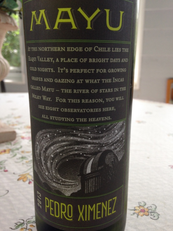 A white wine, the Maya 2013 Pedro Ximenez is produced in the Elqui Valley and the Olivier family, who started Vina Mayu in 2005, were the first to bring winemaking to that sub-region. Pedro Ximenez vines, seventy years old, are grown in the free-form “alberello” style to increase their density as well as the “parral” style of trellising. Low yield in order to increase the fruit quality is maintained. Although the Pedro Ximenez grapes are mostly distilled to make pisco, lovely wines are being produced. In my glass with colors of pale lemon with strands of gold, the intense aromas of the Maya 2013 were of citrus, lime, and zest. Refreshing and fruity with a bit of salinity and a bracing finish, this dry wine was just what I needed on a hot late summer day. Cost is $15.