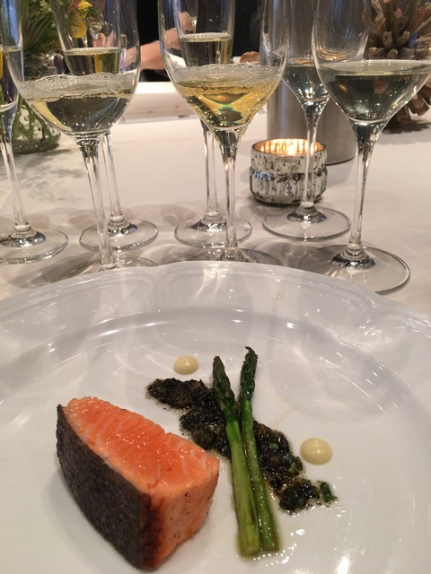 Bubbles were poured! Langlois Chateau, NV ($17), a Cremant de Loire, with a rich mouthfeel and notes of light herbs, citrus, and toast, was a delectable pairing with our first course: potato-spring onion soup with fresh hearts of palm and zhoug crisps. The second course, spinach pasta a la chitarra, smoked whitefish, and yuzu kosho butter, was complemented with a pour of Domaine du Haut Bourg, 2014 ($12) Muscadet Côtes de Grandlieu Sur Lie. Floral aromas and lip smacking acidity with a touch of anise on the finish of this Melon de Bourgogne were a delightful match to the whitefish and pasta.