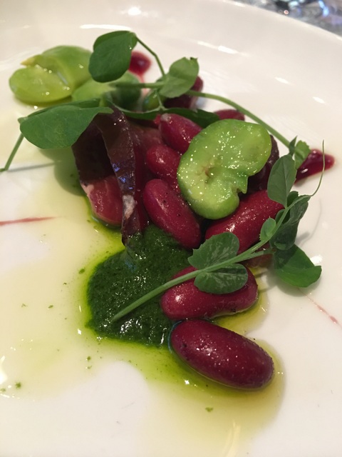 cured and olive oil marinated beef with a bean salad and Malbec sauce inspired by a recipe from Diaguitas, La Rioja in Northwest Argentina. Paired with a glass of elegant, complex