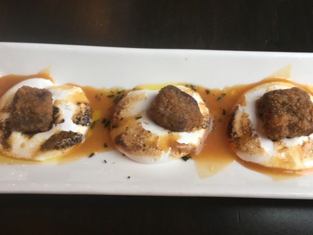 As a surprise, our wonderful server, Stella, presented a sweet finale: chocolate croquettes of deep fried marshmallows with chocolate, bananas, caramel, and rosemary. Another glass of cava? Yes, please!!