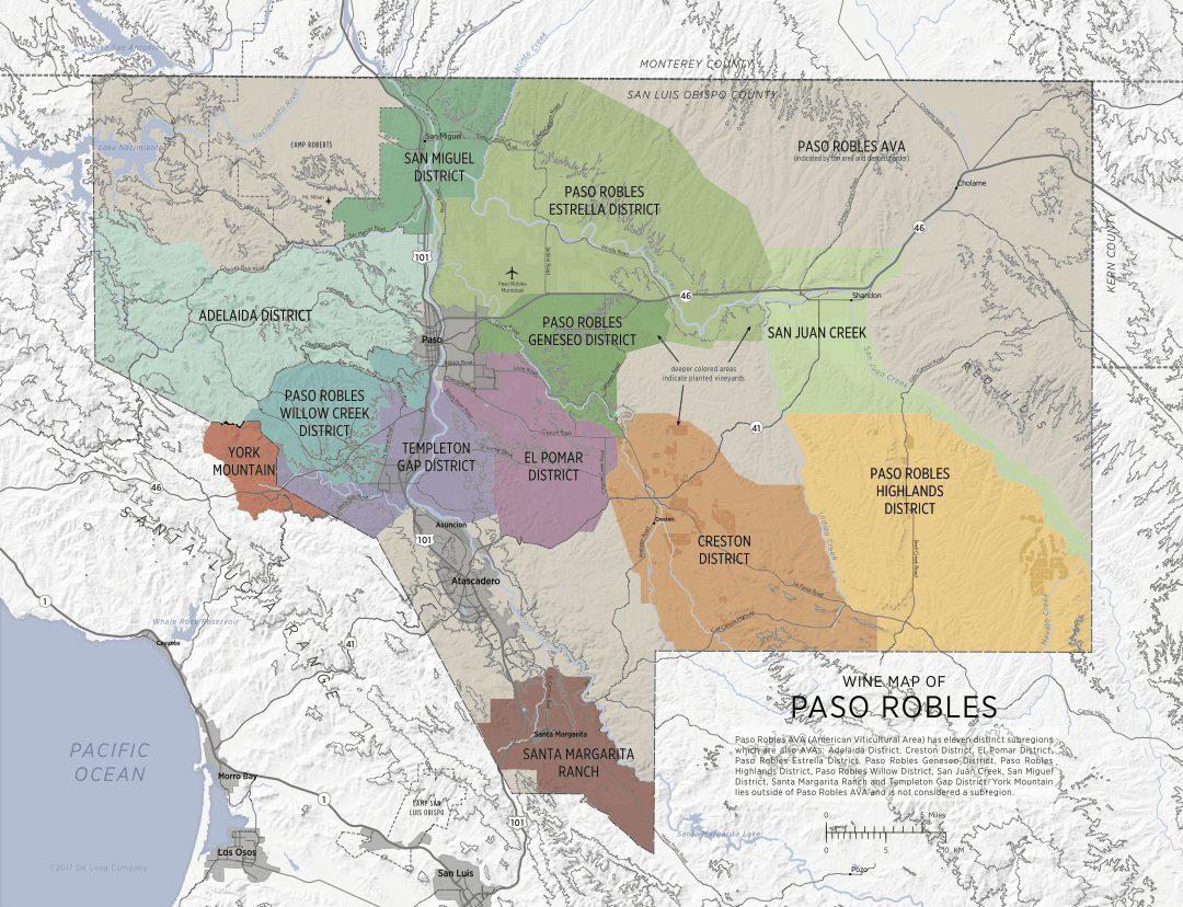 Bordeaux, Rhone, and an ever-growing list of Italian and Spanish grape varieties are not only cultivated, but thriving in the 614,000 acre Paso Robles AVA; 32,000 acres are in wine grape vines, the third largest wine region in California. The region has eleven specific viticultural areas.