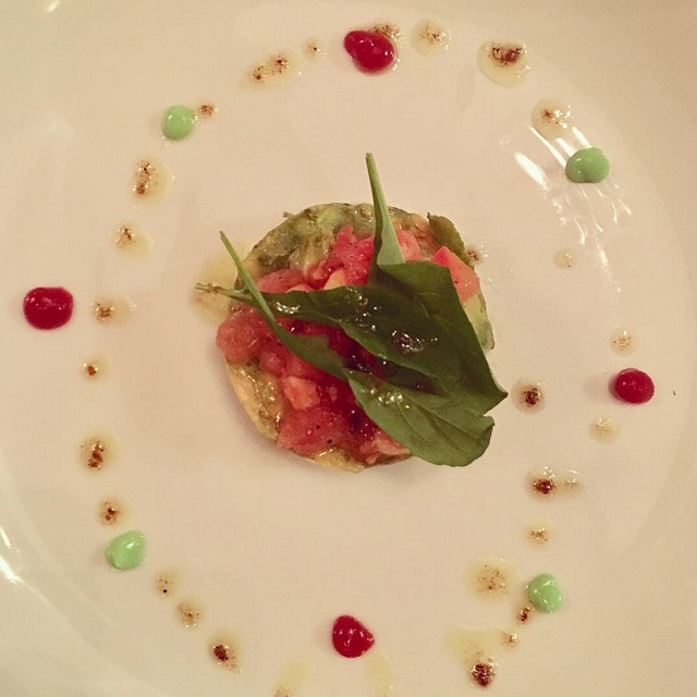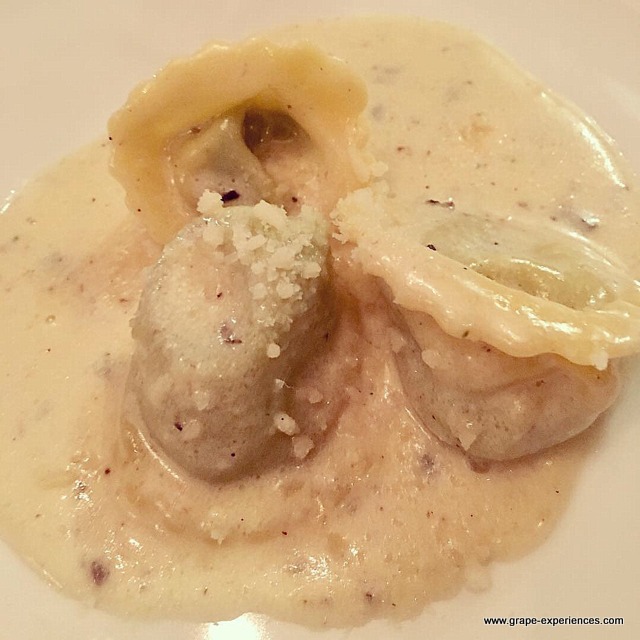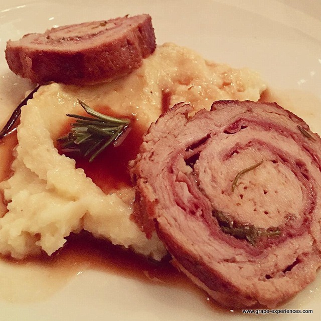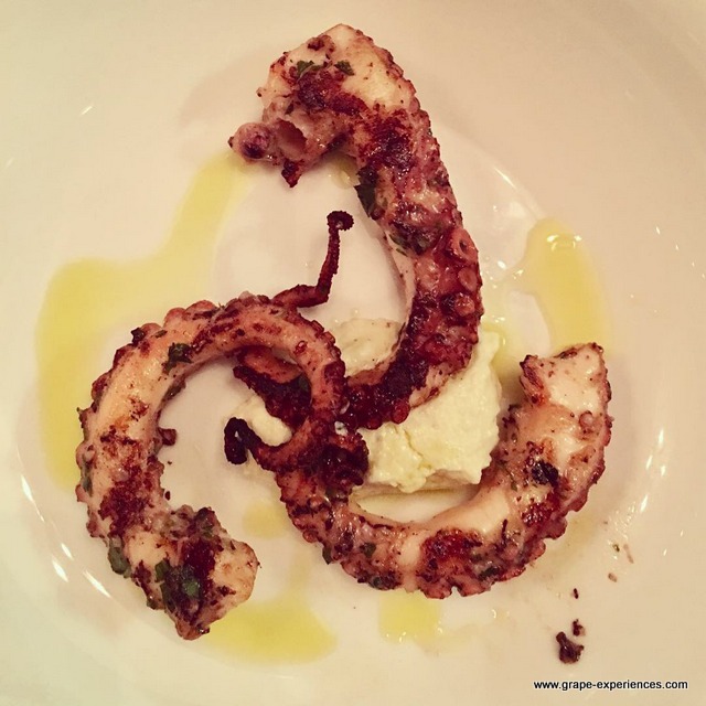 Upon arrival, we were poured a glass of Mofete Bianco 2017, that paired just as effectively with greetings and heartfelt conversation as it did with the first course of Tartar Vegetariana, a light and flavorful mélange of diced tomatoes and hearts of palm layered with an avocado cream. A blend of 70% Carricante and 30% Catarratto from 5 – 30 year-old vines, I noted aromas and flavors of yellow flowers, ripe citrus, minerality, and the slightest hint of balsamic leading to a lingering finish. This refreshing wine was aged in stainless steel tanks for 6 months. Mofete Bianco is Palmento Costanzo’s largest produced wine.